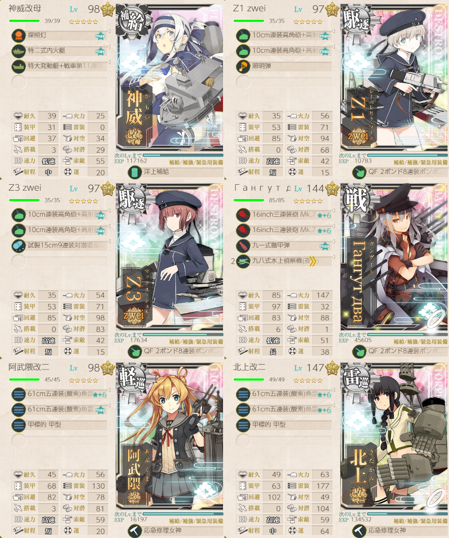 補給艦は補給が仕事ですから、それでいいと思いますが、私は補給艦は第一艦隊にして、第二艦隊の旗艦には魚雷CI艦を配置し、CI率を上げました、とくに欧州艦には特効があるらいいので、運の高いJevisを旗艦にすれば高い確率でCIしてくれて、CI+クリティカルで200ダメージオーバー出してくれます。