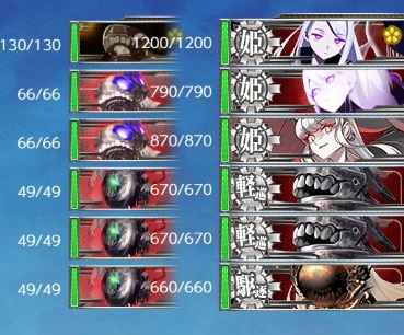 | 【装甲破砕】 [装甲-55?]深海空母蜂姫 全形態? [装甲-36]軽巡ツ級flagship, 軽巡ト級flagship, 空母棲姫II, 駆逐ラ級(初期型), 駆逐ラ級ζ-壊, 軽巡ム級, 巡洋戦艦水姫 |