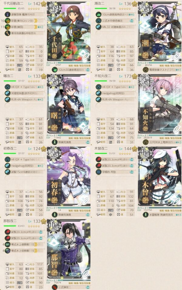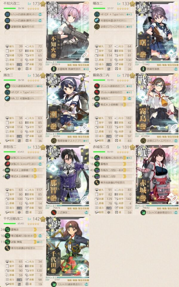 | B組 那智, 足柄, 多摩, 阿武隈, 木曾, 不知火, 曙, 潮, 霞, 初春, 薄雲, 白雲, 朝雲. 大泊 | 1.17 | 1.08 | 1.08 | 1.14 | 1.14 | ||