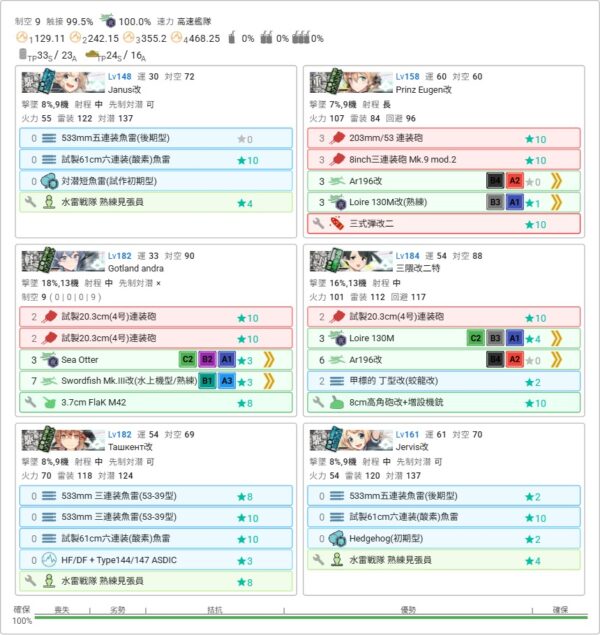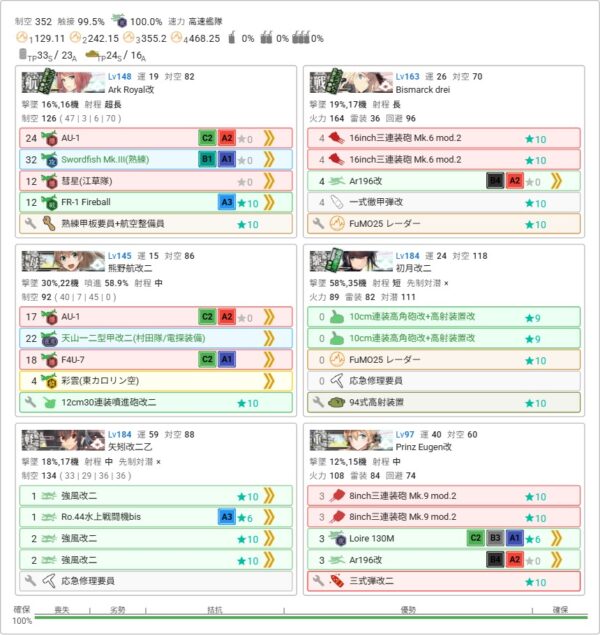 ●Qマスの優勢~確保に、第一艦隊の制空値340程度を目安に調整(画像で352)