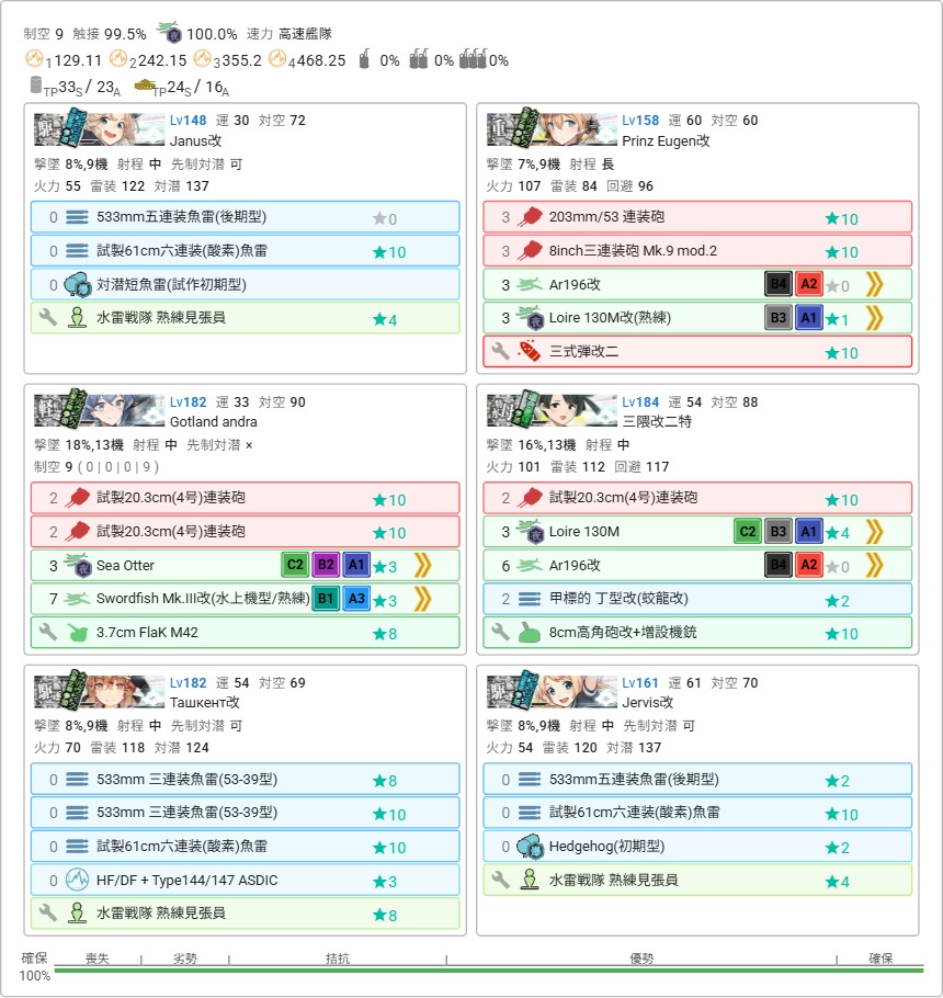 ●Qマスの優勢~確保に、第一艦隊の制空値340程度を目安に調整(画像で352)