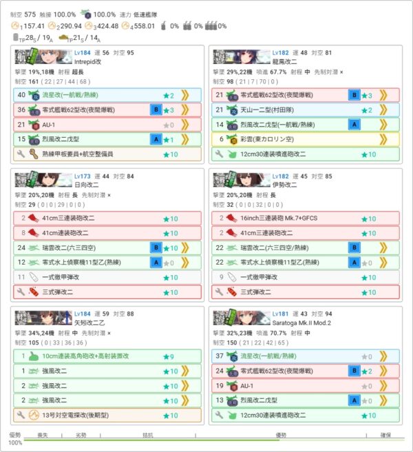 | 艦載機A組 零式水上偵察機11型乙 零式水上偵察機11型乙(熟練) 零式小型水上機(熟練) 紫雲 九七式艦攻改 試製三号戊型(空六号電探改装備機) 九七式艦攻改(熟練) 試製三号戊型(空六号電探改装備機) 天山一二型甲改(空六号電探改装備機) 天山一二型甲改(熟練/空六号電探改装備機) 天山一二型甲改二(村田隊/電探装備) 烈風改二戊型 烈風改二戊型(一航戦/熟練) | 1.02 | 1.03 | 1.09 | 1.03 | 1.06 |
