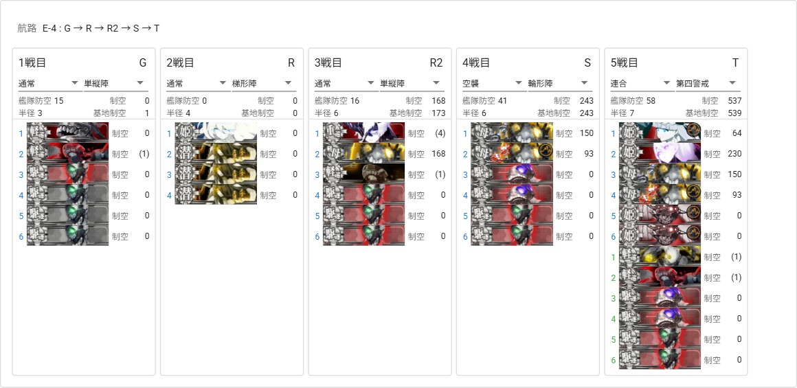 | 基地装備(E4) | 海域倍率 | Nマス 第二ボス | Tマス 第三ボス | Zマス 第四ボス |