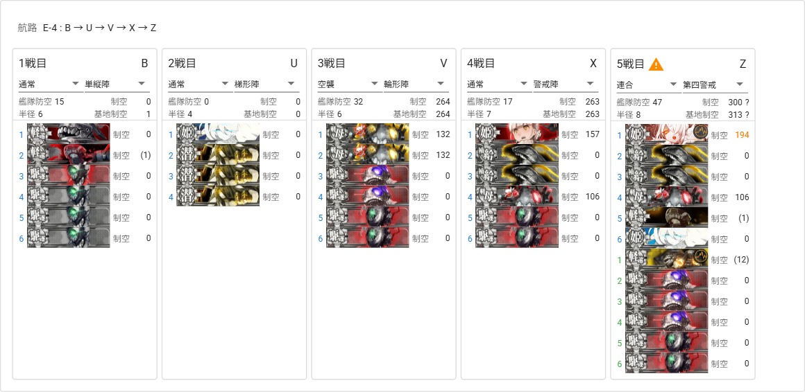 | 艦種/国籍/艦名(E4) | 海域倍率 | B/B1/B2/ D/F/W/X | E/G/Q /R/R2 | Xマス | Iマス 第一ボス | Nマス 第二ボス | Tマス 第三ボス | Zマス 第四ボス |