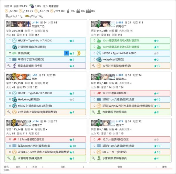 例えば朝霜や清霜等に1ソ対潜して単横陣で抜けることも考えられます(D/魚/ソ/電)