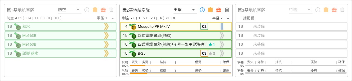 | 装備(陸戦/局戦/陸偵/飛行艇) | 対空 | 半径 | A1 | A2 | A3 | B1 | B2 | B3 | B4 | C1 | C2 | C3 | |||