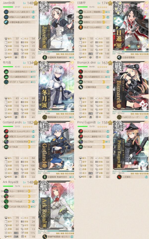 兎に角ゴトランドが道中で被弾しまくった。陣形変えても順番変えてもよく当たった。ボス前のTマスは最初単縦陣でやってたけど警戒陣に変えた。(記事が警戒陣だから最初からしろや)