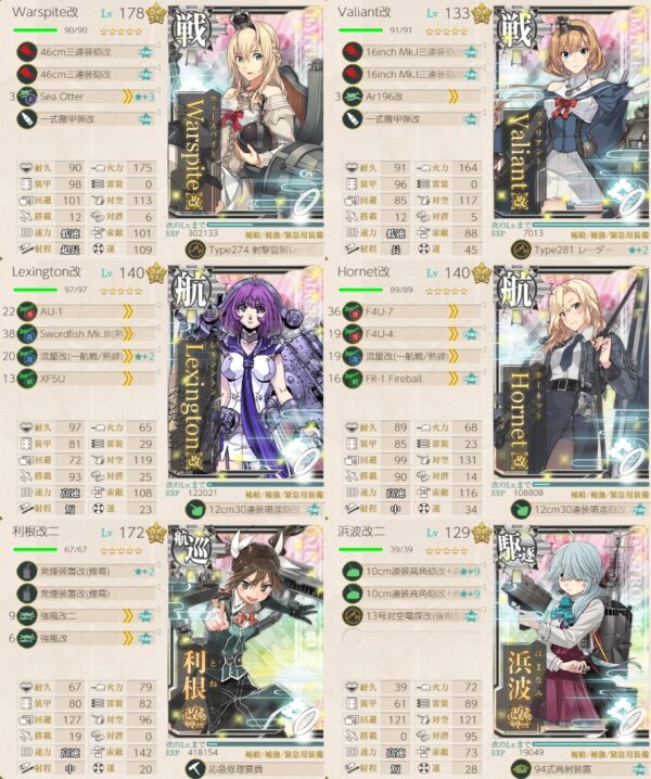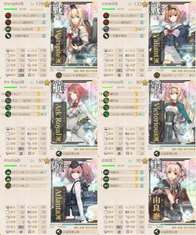 Warspite(1番手/3隻中) Valiant(1/1) Ark(1/5) Victorious(2/3) 照月(1/4) Commandant(2/3)