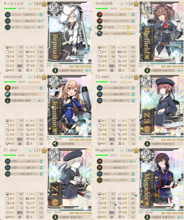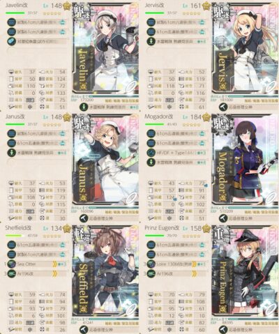 道中が厳しく特効艦の回避補正をもらいたいので、欧州特効を持つ艦で固めています。