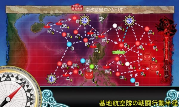 戦闘行動半径 G:通常(3) R:潜水(4) R1:空襲(5) R2:通常(6) S:空襲(6) T:ボス(7)