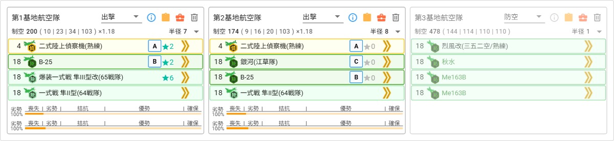 画像例の特に1部隊目は艦載機熟練度がなくてもすれすれで航空劣勢になる想定です。
