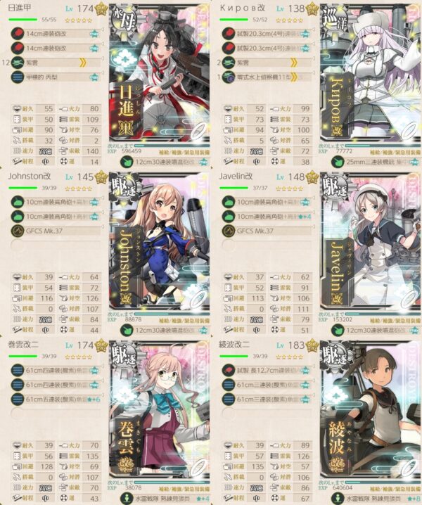 | 四航戦 金剛, 榛名, 伊勢, 日向, 龍鳳, 羽黒, 高雄, 妙高, 時雨, 初霜, 響, 潮, 浦風, 神風 | 1.16 | 1.03 | 1.06 | 1.09 | 1.09 | 1.12 | ||