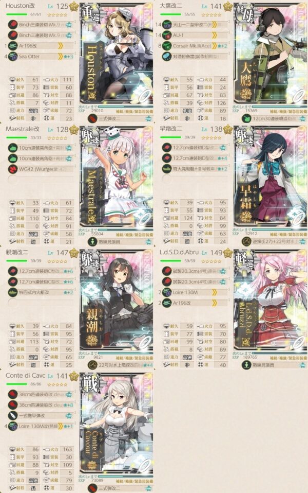 ・記事例はゲージ破壊を想定し、大鷹のみ対潜先制爆雷攻撃可能な装備例になっています。