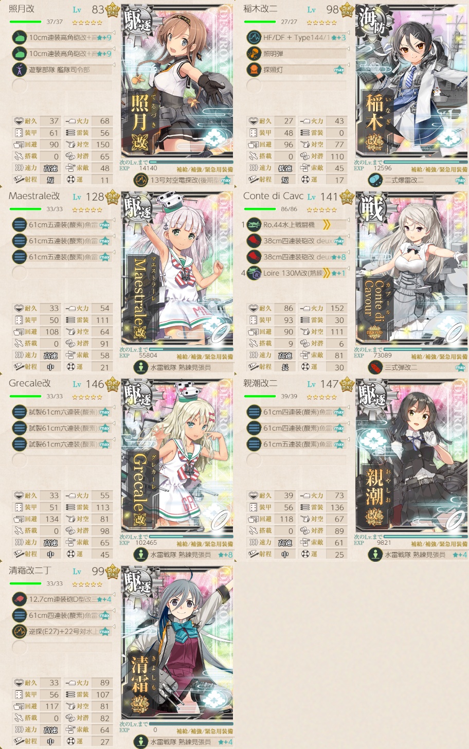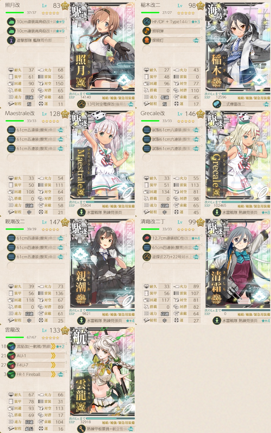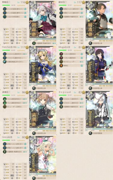 どうしても道中が運ゲーになるので多少ムラがありますが、夜戦込みなら削りはS取れます。(T字不利や反航戦引くと削りでも夜戦Aになりがち)