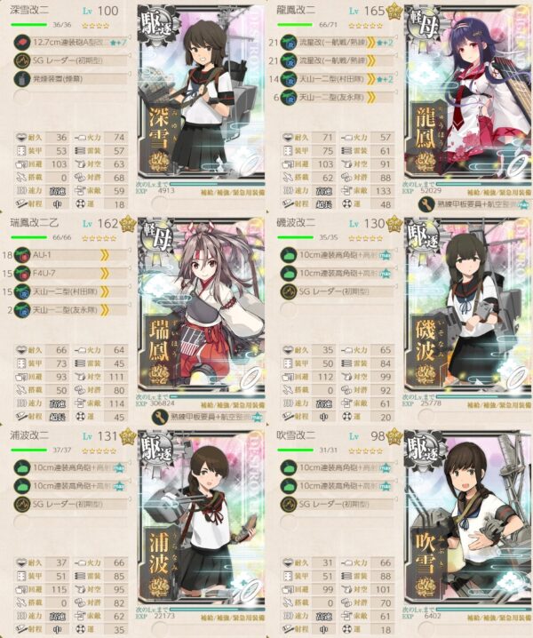 大鳳91、飛鷹90、吹雪98、深雪11、磯波9、浦波9