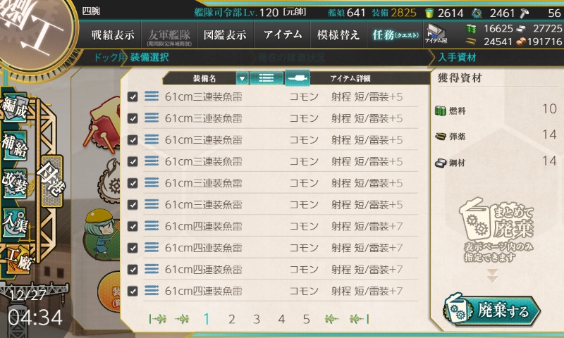 「中口径主砲」×10, 「魚雷」×10, 「爆雷兵装」×10 を廃棄したのに50%達成だけ・・・