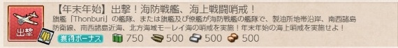 2025/12/27に実装された任務の一つ。年末年始恒例の期間限定任務で、海防戦艦を含む艦隊で出撃します。