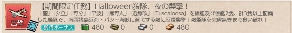 【期間限定任務】Halloween狼隊、夜の襲撃! (出撃ウィークリー) | 南瓜1 or 給糧艦「間宮」2 南瓜1 or 弾薬4800 or 開発資材36 |