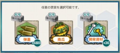 Halloween艦隊 実りの秋、強襲演習! (出撃ウィークリーの前提) | 間宮1 or バーナー6 or ネジ4 南瓜1 or 燃料4200 or ボーキ2700 |