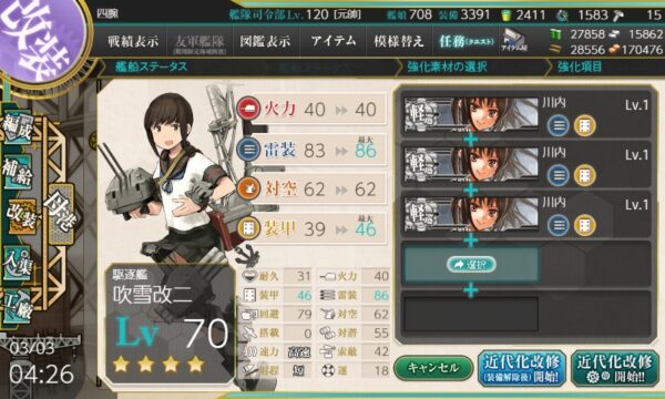 - [吹雪型]に対し[川内型3]の近代化改修を3回成功させ達成