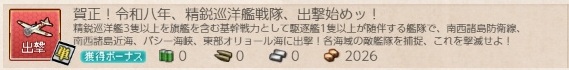 2026/01/01のオンメンテで実装された新春任務の一つ。2つ目の任務では、軽巡級を旗艦にし、鎮守府近海の各海域に出撃します。