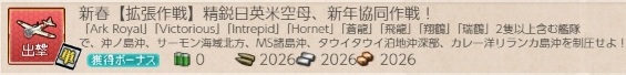 2025/01/01のオンメンテで実装された任務の一つ。新春出撃任務のラストで、指定の空母を含む艦隊で各海域に出撃します。
