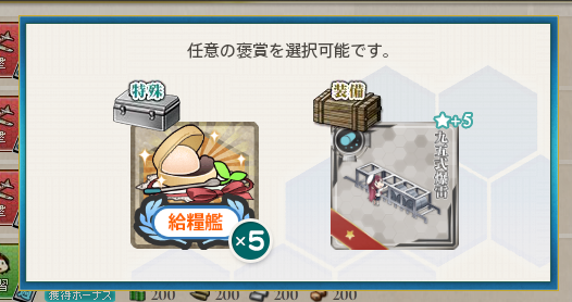 報酬は二式爆雷が既に五個あり九五式爆雷もいくつかありこれ以上は要らないだろうということで伊良湖を選択、C型✩5の価値がどの程度かよくわからないですが改修に手が回っていない現状戦闘詳報の方が無難と考え戦闘詳報を選択
