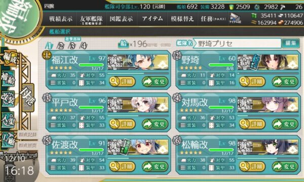 支援艦隊はランダムでcond値が減少しますが、野埼改の方が連続で支援に出せる可能性が上がります。