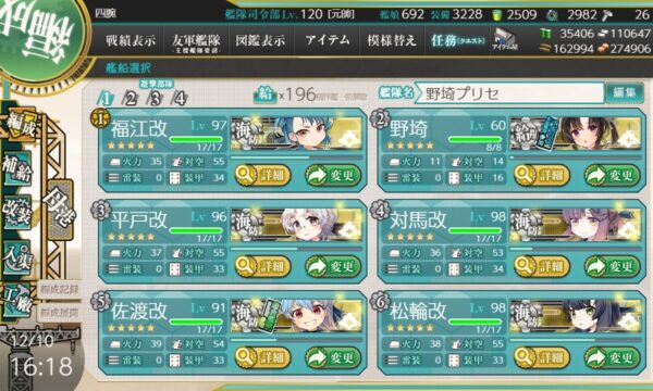 第四海域の第四ゲージでは、新艦娘の「南海」や「Dace」を掘ることが可能です。特に南海は、改装先の野埼が新システムに関わる為積極的に掘っておきたいです。 全海域クリア後(札フリー)を想定した編成です。 目次マップ情報ドロ …