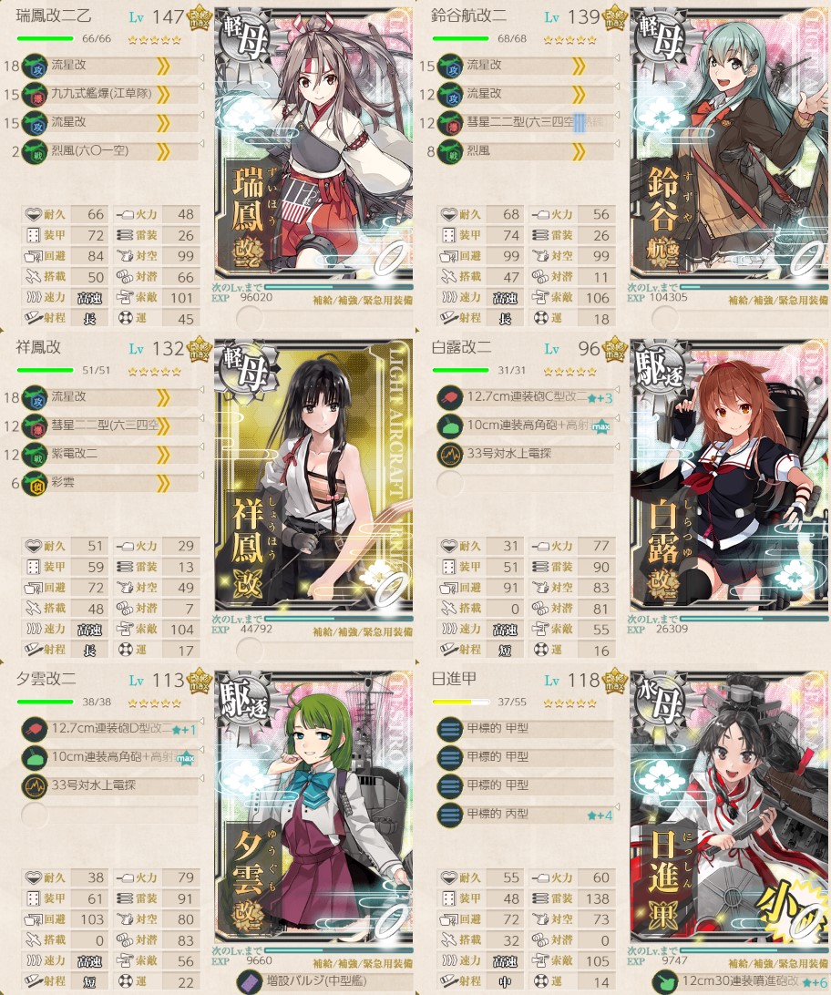 被弾を考え重めの編成ですが、軽空母1-2隻を駆逐にしても十分回せそうです。
