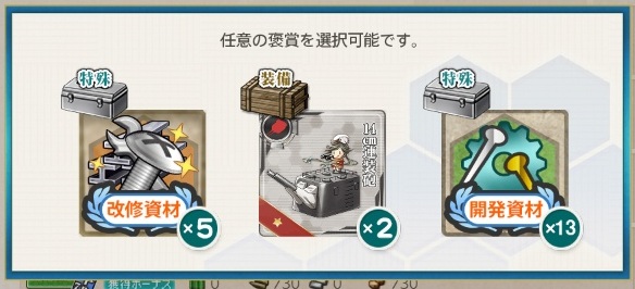 - 改修資材5 or 14cm連装砲×2 or 開発資材13