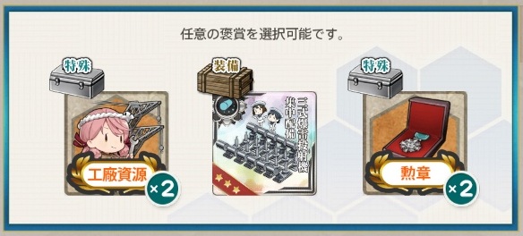 - 工廠資源2 or 三式爆雷投射機 集中配備 or 勲章2