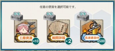 改装設計図1, 戦闘詳報1, 新型兵装資材5, 開発資材280, 高速建造材800