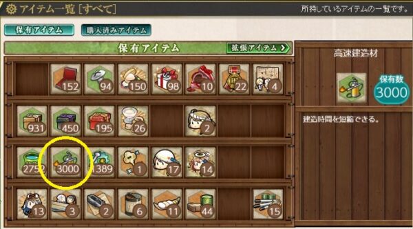 大型艦建造での画像。高速建造にすると10個消費する。