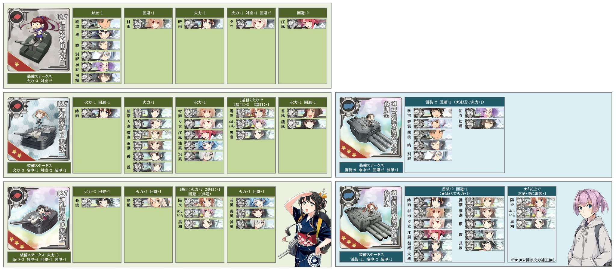 備考:装備改修値・3スロット目の装備は考慮せず。12.7cm連装砲B型改四(戦時改修)+高射装置は別枠。 |