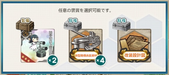 • 22号対水上電探改四×2 or 新型砲熕兵装資材4 or 改装設計図