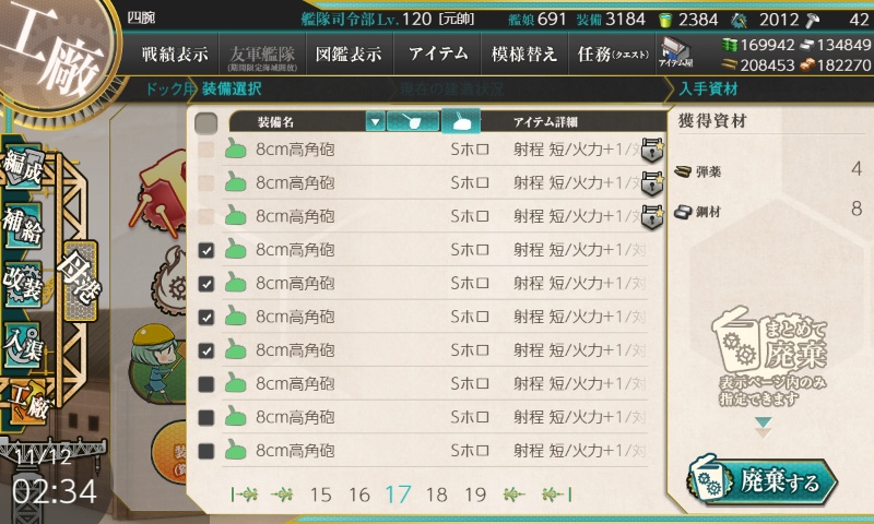 高速建造材18・開発資材18・秋刀魚8を準備 - 8cm高角砲×4廃棄し達成