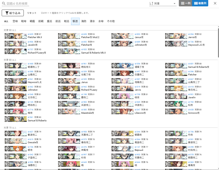 駆逐艦のレベル99基準での対潜値ですが、文月、涼月、松風、旗風も70以上ありますので、お時間あるときに対応いただけると助かります。