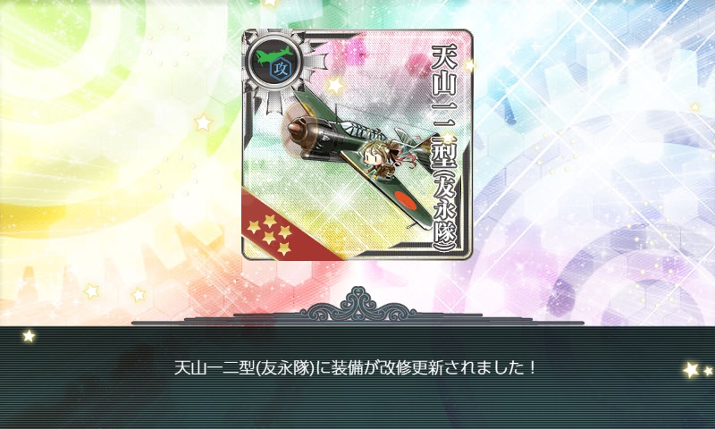 | 更新時消費装備合計:九七式艦攻12 天山11 新型航空兵装開発資材1 熟練搭乗員2 | ||||