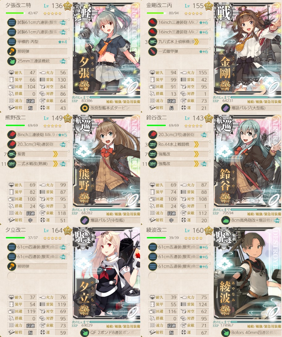新三川と兼ねて5-3済ませました。夕張改二(特ではありません)鈴谷熊野衣笠鳥海加古。装備は普通の2号や3号の連撃装備。支援は道中決戦ともガチ。