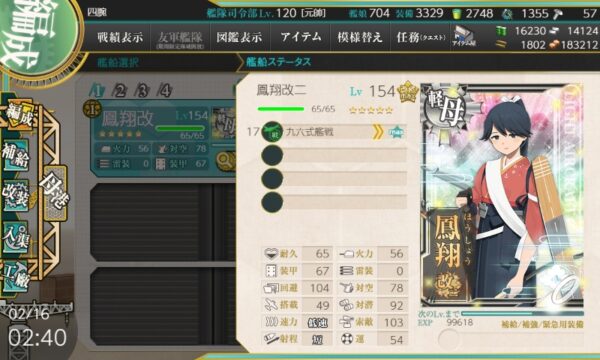 - 鳳翔(秘書艦)に九六式艦戦☆MAX(熟練度MAX)を装備